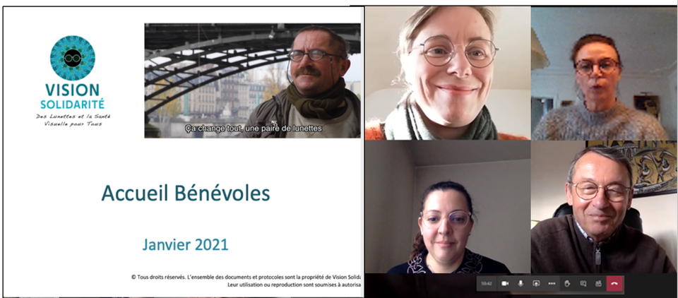 Ce vendredi 8 janvier, a eu lieu le premier accueil de l’année pour les nouveaux et nouvelles bénévoles. En visio, pendant une heure, Catherine, opticienne-optométriste à Rennes et Liza, optométriste ont pu échanger avec Jean-Paul Roosen, président de l’association, et Laetitia Négroni membre du CA de l'association et coordinatrice de l'équipe des bénévoles, sur les missions et les valeurs de Vision Solidarité, les actions à venir et les bonnes pratiques…