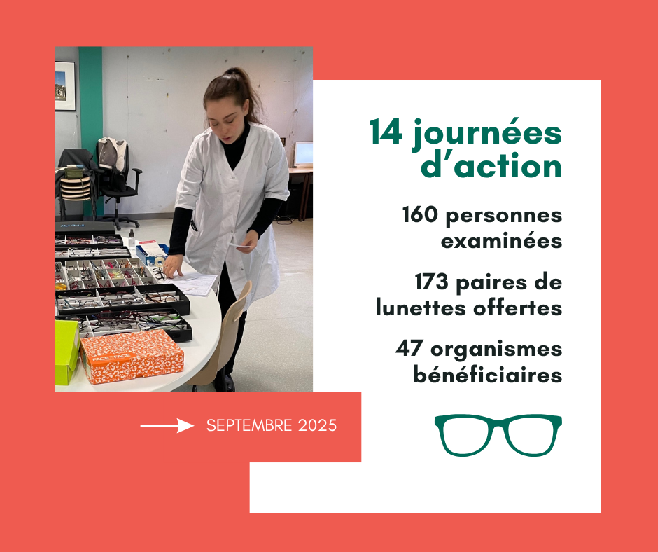 En septembre, 160 personnes ont bénéficié des journées d’action de Vision Solidarité. 173 paires de lunettes à la vue ont été offertes : 53 % pour la vision de loin, 17 % pour la vision de près et 34 % équipées de verres progressifs.